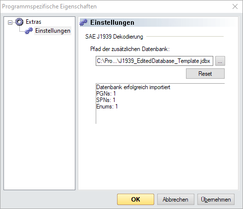 importiert und angezeigt, wie viele PGNs, SPNs und ENUMs importiert wurden. Im