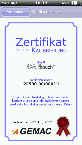 den Nachweis zur Kalibrierung im Menü unter >Einstellungen >Informationen